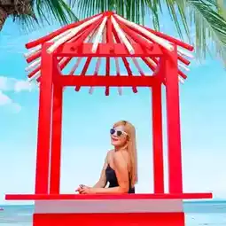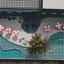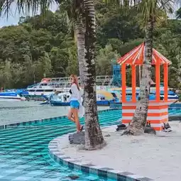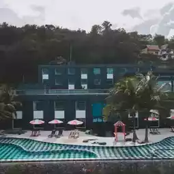 𝙎𝙞𝙡𝙝𝙤𝙪𝙚𝙩𝙩𝙚 𝙋𝙤𝙤𝙡 & 𝙋𝙡𝙖𝙮𝙜𝙧𝙤𝙪𝙣𝙙 The swimming pool here is decorated in a black and white plaid pattern. There are beach chairs to sit and chill and enjoy a 180-degree view of the sea.