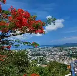 👉It is a high angle viewpoint of Phuket City, where you can see Phuket City contrasting with the clear sky. On a sunny day, you can see the Phuket Sea in the distance. At this time, the peacock flowers are in full bloom, with their orange color contrasting with the blue color, which is beautiful.