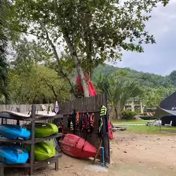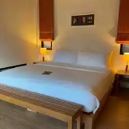 The Mangrove by Blu Monkey is a resort located next to the mangrove forest, located near Ao Yon and Khao Khad viewpoint. The atmosphere is full of lush green trees inside the accommodation. It is a resort that is not too small or too big. The atmosphere inside the room is simple. There is wood in the table, chairs, and partitions to divide small zones, including dining areas, glass tables, a small kitchen, oven, sink, and small bar inside. There are also complete amenities. The resort has many activities to do, such as a cafe, a large chess table, a communal swimming pool, canoes, and paddle boards, which are enjoyable throughout the vacation. It is another beautiful resort that impressed us very much for our Phuket trip this time. 😊