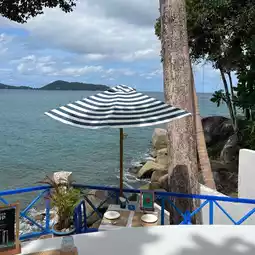 #Cafe Review The leef, a newly opened cafe with a sea view, Santorini feel, blue and white color scheme. It is a very comfortable cafe to sit in. Here, there are both drinks, food and fresh fruits available.