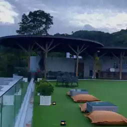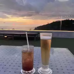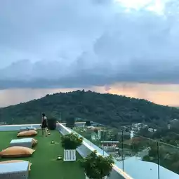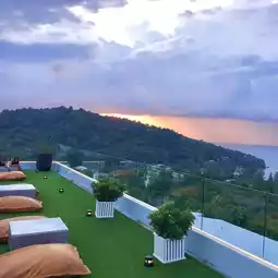 A rooftop restaurant and bar at Crest Resort and Pool Villas. When you arrive at the hotel, contact the hotel's PR. An officer will drive you up to the hotel's lobby. The restaurant is on the top floor. There is an elevator to take you up. The hotel is beautiful and stylish, built on a mountain. The atmosphere up there is very good. The wind is strong and cool. You can see the mountain and sea view on the Patong side.