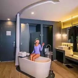 The room has a bathtub