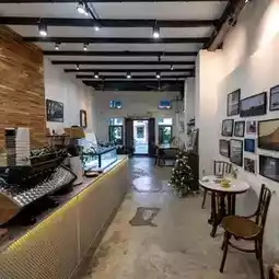 The shop is located in Soi Rommanee, on the ground floor of The Rommanee Boutique Guesthouse. The shop is a Sino-Portuguese style building painted in dark green with cool street art painted on the two pillars, making it stand out. In front, there are outdoor tables decorated with beautiful trees. The interior is decorated in a chic minimalist style, with exposed concrete walls, vintage wooden furniture, and photos taken by the shop owner on the walls, beautifully balanced and comfortable. Inviting you to sit and chill for a long time.