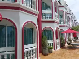 Another highlight of this place is probably the outdoor swimming pool corner, decorated with red umbrellas around the pool, contrasting with the blue water. There are white and red rooms as a backdrop, looking beautiful. Swimming is good, taking pictures is also beautiful.