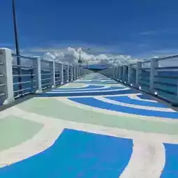 There is a concrete bridge extending into the sea. The walkway is decorated with colorful and beautiful graphics.