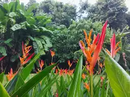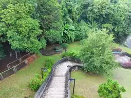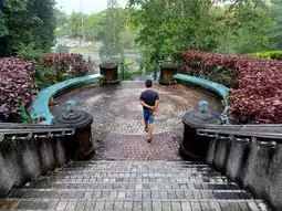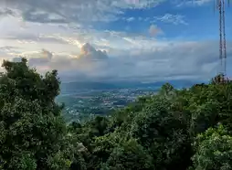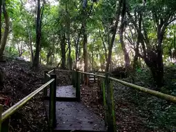 The viewpoint has a spacious parking lot. You have to walk up the stairs to the viewpoint. The atmosphere on top is shady with many trees. There is a nature trail that is a strong concrete path and benches to rest at intervals.