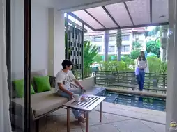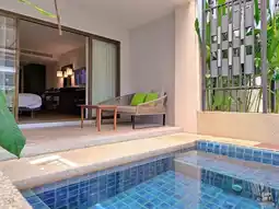 A room with a view of the swimming pool with a private Jacuzzi