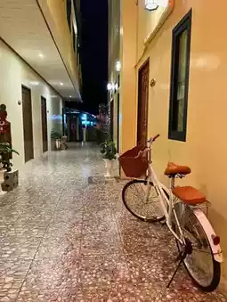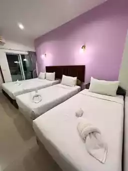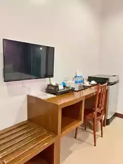 The room we booked was for three people. The room was spacious, clean, and had a balcony. Amenities in the bedroom included a refrigerator, kettle, tea, and coffee.