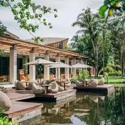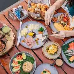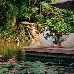 Have breakfast while enjoying the atmosphere by the lake and waterfall with fish swimming around.