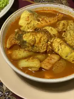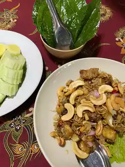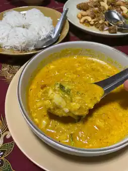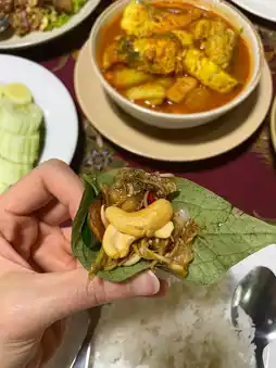 What we like the most is the sour curry with sea bass (200฿). The curry paste is very spicy. If you like spicy food, you have to order it!! The sea bass is large and there are many pieces. They add young coconut and choen, which is similar to lotus stems. It's a southern vegetable. I wanted to finish the bowl, but it was so spicy that I was crying. 😭😂