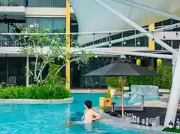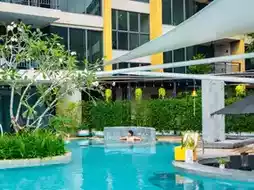 นอกจากความสวยงามของท้องฟ้าและยามเย็นแล้วจะไม่พูดถึงบรรยากาศชิลล์ๆ ริมสระน้ำของที่นี่ก็คงไม่ได้ สระว่ายน้ำของที่นี่มีขนาดใหญ่เลยค่ะ และยังมีบาร์ริมน้ำที่มีชื่อว่า “Splash Pool Bar” คอยให้บริการเครื่องดื่มอีกด้วย