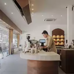 The shop is decorated in white and brown tones.