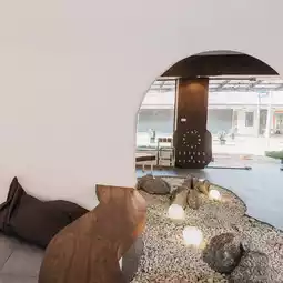 A minimalist photo corner with a Japanese rock garden inside the shop.