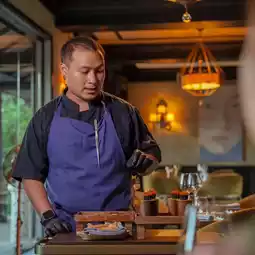 The menu available will be π·πππππ π¬πππππππππ π΄πππ in the style of πΊππππ πͺπππππ starting with π¨ππππ π©πππππ, which is served in 3 bites with seafood ingredients, followed by π¨ππππππππ, a 4-course set menu and a main course served with Thai clay pot rice, and ending with a dessert of "Tu Bo", a local Phuket dessert. π