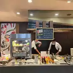 Let's go to the hotel's restaurant. The breakfast room is an international buffet. You can eat as much as you want. The breakfast room opens from 6:30 a.m. to 10:00 a.m. There are so many different kinds of food to choose from that we didn't know what to eat because we really wanted to try everything. As for the hot or freshly cooked food menu, there will be a chef at every counter to serve you dish by dish. What we liked the most was the salmon sashimi. We could just go and get it. It was salmon in pieces without having to put it on bread or other menus. I give it a full 10 points.