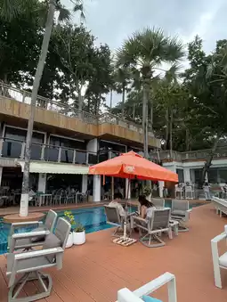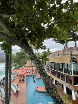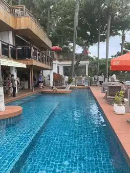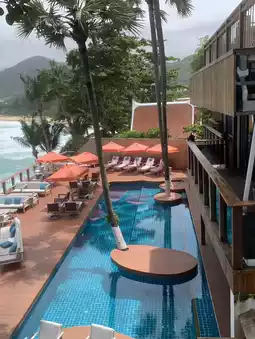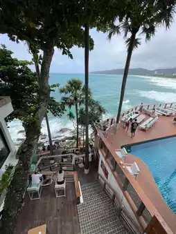 The shop is located on a hill with a view of Karon Beach. Decorated in a Balinese style, there is a swimming pool in the middle of the shop. In addition to drinks, there is also food. #Seaview #PhuketCafe