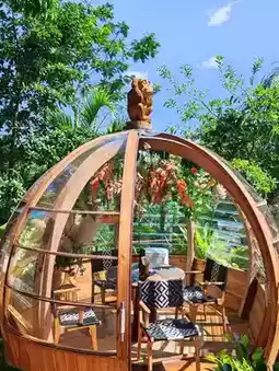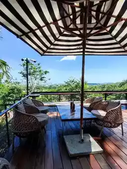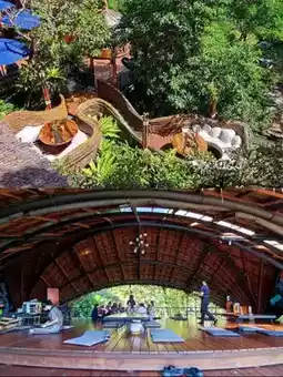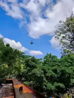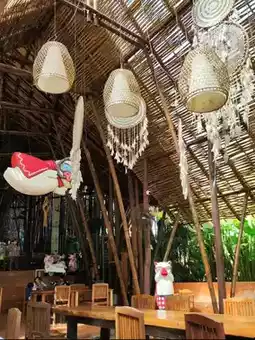This shop is called Three Monkeys. It is located in Hanuman World. If you happen to come during a busy time like me, I waited for 30 minutes. I sat in the front hall and soon the staff led me to the boat to sit on. The shop is mostly outdoor and semi-outdoor, surrounded by forests and large and small trees. The familiar seats are bird's nest seats that protrude from the hill and round glass domes decorated with flowers. But today's seats are dangling seats on the balcony in front of the Balinese tent. Let's talk about the food. This place has both Thai and Balinese food. When it comes to Balinese-style restaurants, you have to eat Thai food. Looking at the menu, Balinese-style food is Indonesian food, so it may not be familiar, so I chose Thai food. I recommend Tom Yum Goong for 180 baht, Shrimp Fried Rice for 180 baht, Shrimp Pad Thai for 180 baht, and Apple Soda for 100 baht. The taste of their Thai food is really good. The shrimp are fresh and large. The price is average, not too expensive. To be honest, it's reasonable. It's not often that I come to eat in an atmosphere close to nature like this. I got to see a view of Phuket from an angle I've never seen before. Anyone who wants to eat and have someone zipline with them can come to Three Monkeys Restaurant. #PhuketRestaurant #PhuketEatTravel #threemonkeysrestaurant #onthegoalsth #TravelWhenTheHeartWantsTo