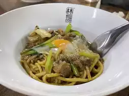 It looks thick and greasy at first glance, and the aroma of the sauce hits your nose when it is served. The ingredients are squid, pork, a half-boiled egg and some vegetables. The noodles are round and thick with a soft texture. The taste is salty-sweet, and it is recommended to mix it with a half-boiled egg for a better taste. The overall taste is similar to the fried noodles eaten in Shanghai alleys, but the texture is not as good as that in Shanghai.