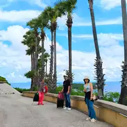At Laem Phromthep, before the sun sets, we can take pictures around the area. There is a concrete barrier and tall palm trees. When taking pictures, it contrasts beautifully with the sky.