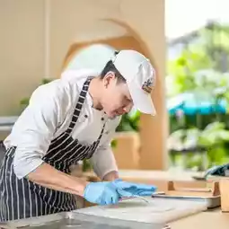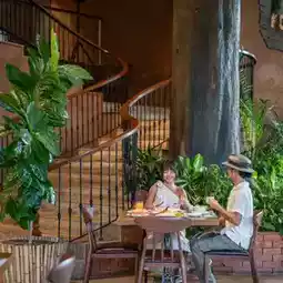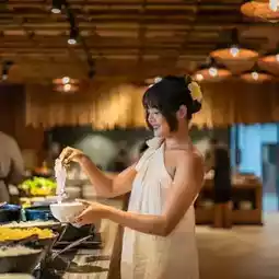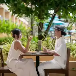 by the pool. The atmosphere is chill. There is a selection of both Thai and international food.
