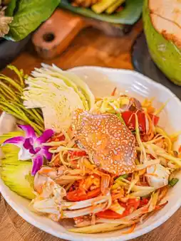 Crispy papaya shreds and fresh flower crab meat are paired together. The papaya shreds are sweet and crispy, and the flower crab meat is fresh and delicious. The sour and spicy taste is appetizing.
