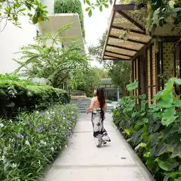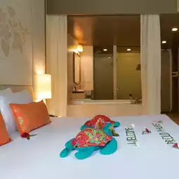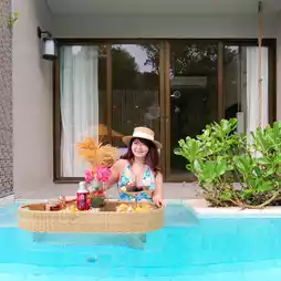 View, Superior Pool Access, Deluxe Pool View, Junior Suite Pool View, Junior Suite Pool Access and Two Bedroom Suite. As for Fern, she stayed in the Superior Pool Access room, a room where you can walk out of the room and get into the pool, making it feel like you have your own private pool. Just open the door and you can swim or soak in the cool water at any time. This room has complete amenities, including a bathtub that opens the curtain to see the pool view.