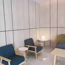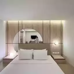 This cozy hotel features a minimalist design with a Japanese touch, emphasizing wooden elements that blend perfectly with other light brown and white furniture, creating a harmonious and high-quality atmosphere.