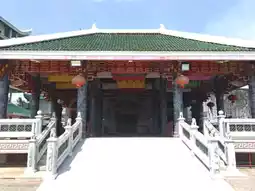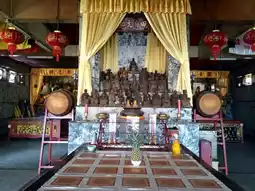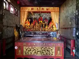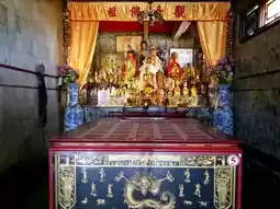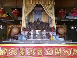 The shrine is based on the architectural style of Chinese shrines. Inside, there are wooden sculptures of Chinese gods and deities.