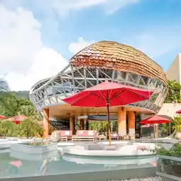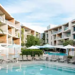 A modern Phuket accommodation with a swimming pool surrounding the hotel, beautifully chic, perfect for taking glamorous photos, the building stands out. Plus it's very shady.