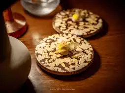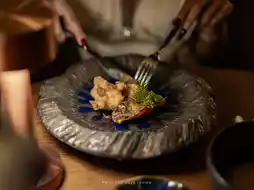 - Second dish: "Crab Waffle with Liang Leaves", thin crispy waffle sheets Served with a sauce of Liang leaves (a popular vegetable in the South) in a shell, served with a crispy, sweet waffle dip.