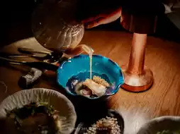 - Third dish: "Bamboo shells" cooked and topped with sea grapes, the flavors go well together and also give a scent reminiscent of the sea.