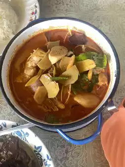 • Sour curry with sea bass: Rich flavor, spicy, and fresh sea bass with large pieces. Fresh bamboo shoots, soft and sweet
