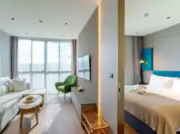 The room that Nuch stayed in was the ๐๐ ๐๐ซ๐๐๐ง ๐๐ฎ๐ง๐ข๐จ๐ซ ๐๐ฎ๐ข๐ญ๐. The room was spacious, divided into a living room and bedroom. The bed was soft and comfortable. You didn't want to get up and go anywhere. There was also a small kitchen corner with complete amenities.