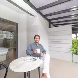 Studio room with pool view that comes with a large private balcony for relaxing and enjoying the beautiful view