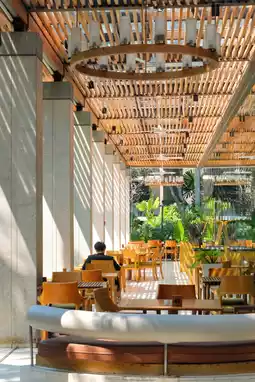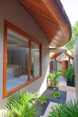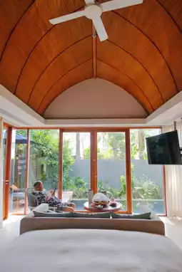 The villas resemble dark, inverted coconut shells, a design that reflects the local character. The black tiles, the color of coconut shells, are not flashy, but blend seamlessly with nature.