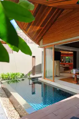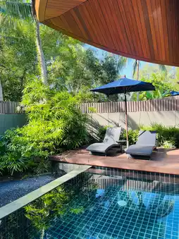 I booked a pool villa. During check-in, the front desk staff gave us a detailed introduction to the hotel's facilities and activities. Then, a golf cart took us to our villa, which was hidden amidst lush greenery, offering a high level of privacy. We had three people in our party, so an extra bed was added, and there was still plenty of space. The natural wood tones created a cozy, home-like atmosphere.