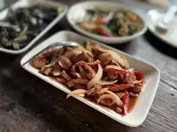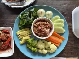 Gin Nee Ta Restaurant is set in a shady and cool garden atmosphere, perfect for chilling and enjoying the natural breeze. If you love authentic Southern Thai cuisine, don't miss out on this place. They offer delicious dishes like spicy and flavorful Nam Prik Pla Ching Chang, which pairs perfectly with fresh vegetables and hot steamed rice.