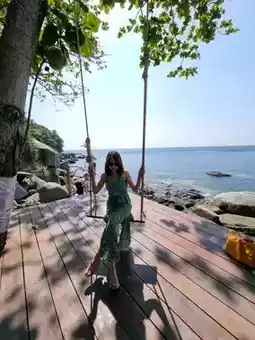 If you come to Phuket and don't stop by, you're missing out! This cafe is called "Suea Puan Mon Bai". Let me tell you, the atmosphere is amazing. The sea view is worth millions, but the price is very cheap. The cafe is located on a hill, next to the sea, very close to nature. The seats are in steps, gradually going down to the wooden swing by the sea. The photo spot is so cool!