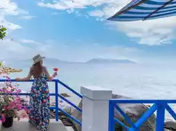 The staff will recommend you to walk to the cafe zone. The cafe zone is decorated in white and blue tones. Tables and chairs alternate with white and blue umbrellas, which are the highlight of the cafe. The cafe area is all outdoor. The photo corner has a point view of the shop, which is a wooden door frame facing the sea. There will be a logo of the shop hanging down. It is a highlight of this place. Another corner is a blue swing facing the sea. The atmosphere is good, quiet, the wind is cool and comfortable. There is shade from the shop's trees.