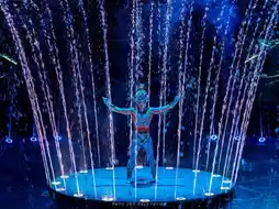 A performance amidst a curtain of water by actors in fantasy costumes Soaring through the rushing water with exciting music, like the god of the sea waking up from his sleep.