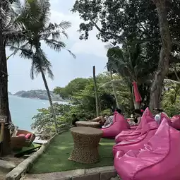 This cafe is located in the Kalim Beach area towards Kamala Beach, but it is located on a hillside, making this cafe incredibly beautiful. The cafe is decorated in a Balinese style with bird's nest baskets and pink photo props, contrasting beautifully with the sky and the sea. 🌊🌤️🌈