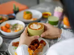 For coffee lovers, there's also a latte, cappuccino. Here, premium coffee beans are used, medium roasted, and you can sip it with your breakfast. Or if you like matcha, there are many menus to choose from.