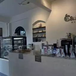 A cozy white wooden house-style café 🤍 Decorated with wooden furniture, clear glass, natural light shines throughout the shop 🪞✨