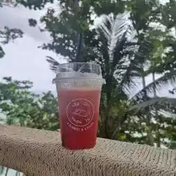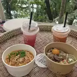 • Full menu: Coffee (e.g., Espresso/Iced Americano), cocoa, tea, smoothies, and single dishes like Mala Spaghetti and Garlic Rice with Grilled Beef and Cured Egg.