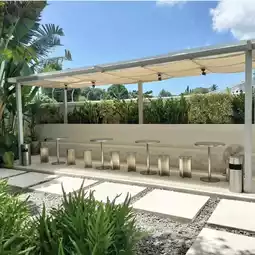 • Modern design in white and wood tones with curved glass doors that are very airy and spacious. The ground floor is a cafe, the second floor has a small meeting room, and the third floor is an open-air workshop.