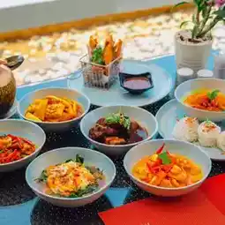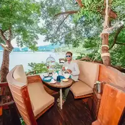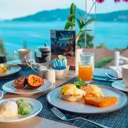 Both a restaurant, a bar, a photo corner, and a beautiful sea.