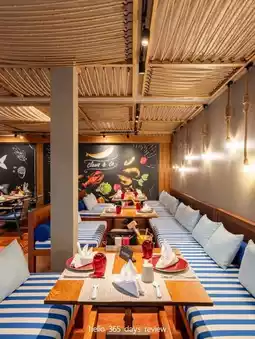 At Claws and Co, every meal is a celebration of taste, with a chic, modern atmosphere mixed with a beach vibe. The ceiling is decorated with large ropes and blue and white striped cushions, giving the feeling of being transported to an adventure on the pier.