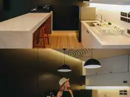 Inside the room, there is a small kitchen, a work desk, and a living room area