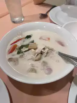 A fragrant coconut-based soup with a slightly sweet and tangy taste. The chicken is tender, making it suitable even for those who prefer milder flavors.