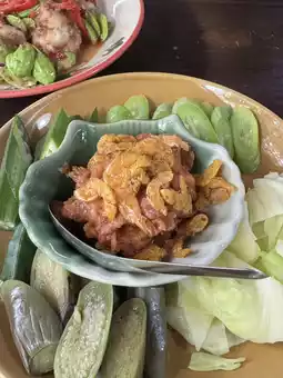 * * Shrimp paste chili dip – Fragrant with shrimp paste, sour, sweet, salty, and spicy, a true Southern Thai flavor. Served with side vegetables, the crispy shrimp paste is delicious.